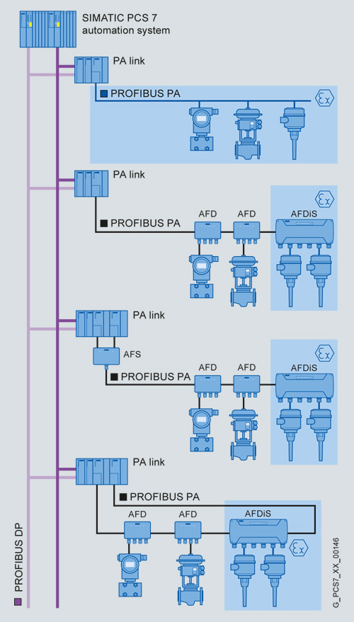 Для построения такой системы связи сегмент сети PROFIBUS PA подключается к двум модулям FDC 157-0 через активный полевой разделитель AFS. При этом модули FDC 157-0 могут устанавливаться в блок связи DP/PA Link с одним или двумя резервированными интерфейсными модулями IM 157. Разделитель AFS выполняет функции своеобразного коммутатора и обеспечивает автоматическое подключение линии PROFIBUS PA к активному модулю FDC 157-0 из данной резервированной пары. Гибкое модульное резервирование обепечивается группировкой устройств в различные PROFIBUS PA сегменты. Только одна PROFIBUS PA линия может подключаться через разделитель к одному DP/PA Link.  PROFIBUS PA кольцо не может быть реализовано на этих средствах.