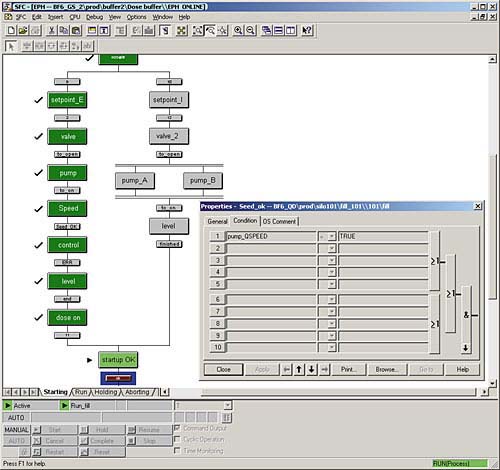 Разработка SFC планов выполняется в соответствии с требованиями ISA S88. Каждый план может содержать до 8 независимых цепей и особые команды. Например, HOLDING и ABORTING для систем противоаварийной защиты или для выбора различных режимов работы системы.