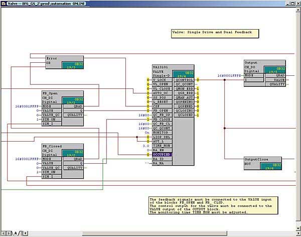 Библиотеки содержат обширный набор блоков, в состав которых входят простейшие логические блоки и блоки приводов, технологические блоки с встроенными функциями оперативного управления и обработки аварийных сообщений, блоки двигателей и задвижек с подготовленными экранными формами, а также блоки для подключения приборов полевого уровня через сеть PROFIBUS-DP и PROFIBUS-PA профиля 3.0.