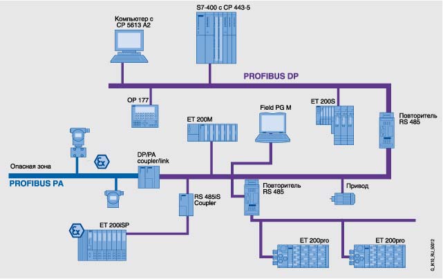 - В зонах повышенной опасности используется протокол PROFIBUS-PA, соответствующий требованиям международного стандарта IEC 61158-2. Скорость передачи данных равна 31.25 Кбит/с.