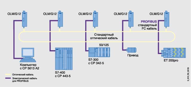 - Магистральная, кольцевая или звездообразная топология, базирующаяся на применении оптических модулей связи OLM.
