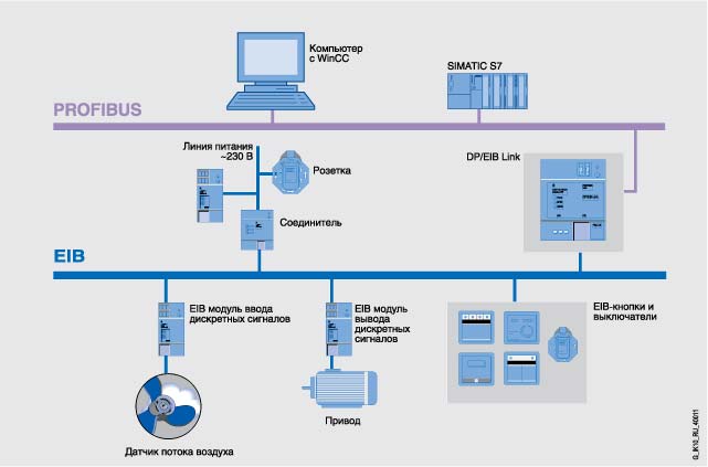 Модуль DP/EIB связи поддерживает два открытых коммуникационных стандарта и позволяет объединять системы промышленной связи PROFIBUS-DP с сетью управления техническими системами зданий EIB.