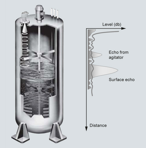 Пульсирующий радар передает микроволновый импульс от антенны, выдающая волны, которые отражаются на границе разделительного слоя между двумя материалами с различной диэлектрической константой (атмосфера и измеряемый материал).Эхо преобразуется преобразователем и время прохождения используется для вычисления уровня. Преобразованное эхо передается цифровым способом в профиль эхо-сигнал. Профиль анализируется для определения расстояния от поверхности материала до точки отсчета прибора.
