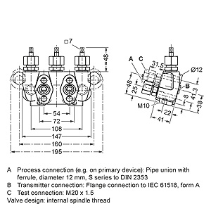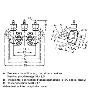 3-х ходовой вентильный блок DN 8 с приварной цапфой, размеры в мм