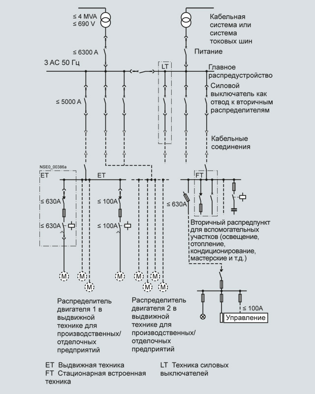 Распределение энергии в низковольтной сети в основном осуществляется через главный щит (силовой центр) и множество вторичных или двигательных распределителей, называемых также центрами управления двигателями (МСС). См. пример рядом.