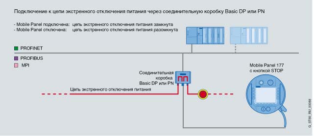 При использовании соединительных коробок версии "Basic", отсоединение мобильной панели размыкает цепь экстренного останова и таким образом вызывает функцию экстренного останова. Поэтому эта конфигурация является лучшим приложением для случая когда мобильная панель соединяется с оборудованием в одном месте (пример конфигурации: Mobile Panel 177).