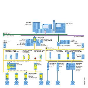 AS-нтерфейс заменяет кабельные линии и соединяет дискретные и аналоговые исполнительные механизмы и датчики, например, пускатели, вентили, светоиндикацию, управляемые от SIMATIC или PC.