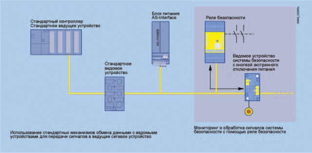Компоненты автоматики безопасности могут подключаться к любым точкам AS-Interface. В одной сети AS-Interface может использоваться несколько реле безопасности.В распределенных системах автоматики безопасности на основе AS-Interface с момента срабатывания датчика безопасности до формирования сигнала на перевод технологического оборудования в безопасные состояния требуется не более 40 мс.