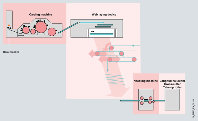 Задача состоит в преобразовании постоянной скорости поступления полотна в прерывистую с поддержанием постоянства массы на единицу площади. Материал передается между подающим и покрывающим конвейером на заданную позицию. Две подвижные каретки зигзагообразно укладывают нетканое полотно на расположенную под углом 90° к оси машины конвейерную ленту. Управление движением нижней каретки определяет ширину продукта, верхняя каретка действует в качестве накопителя материала для компенсации разницы скоростей между подающим конвейером и кареткой. На относительное движение обеих кареток дополнительно влияют параметры процесса, таких как, например, желаемое наложение полотна в области кромок, так называемое профилирование. Высокодинамичные движения поворота кареток реализуются с серводвигателями без дополнительных передаточных механизмов. Желаемое количество слоев материала, а значит и удельная плотность текстильного материала (измеренная в г/м²) определяется отношением скоростей на входе и выходе раскладчика.