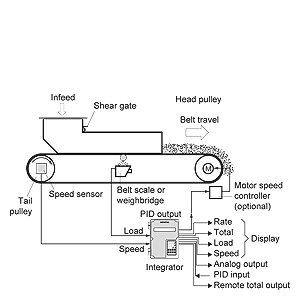Ленточный весовой дозатор обеспечивает точное измерение массового расхода материала. В большинстве приложений уровень материала на ленте устанавливается регулируемой, механической заслонкой в зависимости от размера частиц материала. В этом случае регулирование расхода материала через дозатор осуществляется с помощью регулирования скорости ленты. Но в некоторых случаях скорость ленты остается постоянной и управление расходом материала при необходимости берет на себя подающее устройство. Весовой дозатор состоит из трех компонентов: датчиков взвешивания, датчика скорости и интегратора.Также в комплект входит механическая система подачи материала. Во время работы дозатора нагрузка и скорость ленты постоянно измеряются и на основании этих данных вычисляется значение расхода материала. Измеренное значение расхода сравнивается с заданным значением и в случае рассгласования значений встроенный ПИД- регулятор осуществляет необходимую коррекцию скорости ленты.