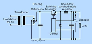 Входное напряжение сети сначала выпрямляется и сглаживается. Емкость конденсатора в промежуточном контуре определяет допустимое время исчезновения входного напряжения. При входном напряжении ~230 В напряжение на промежуточном контуре составляет =320 В. Это напряжение подается на вход 1-тактного преобразователя, который использует высокочастотную широтно-импульсную модуляцию для передачи электроэнергии через импульсный трансформатор. Коммутирующий транзистор работает в ключевом режиме. Потери мощности на нем незначительны. В зависимости от величины выходного напряжения и тока нагрузки КПД стабилизатора может находиться в пределах от 70 до 90%.