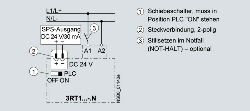 - Контактор управляется без интерфейса непосредственно через DC 24 V/≥ 30 mA PLC выход (EN 61131-2) через клеммы IN+/IN-.