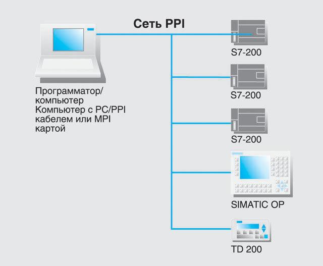 Связь через сети PPI поддерживается операционной системой центральных процессоров S7-200. Соединения выполняются витой парой и могут использоваться для подключения к программатору, устройствам человеко-машинного интерфейса, объединения нескольких контроллеров. Каждый центральный процессор способен поддерживать одновременный обмен данными с другими центральными процессорами, текстовыми дисплеями или панелями оператора. Скорость передачи данных может составлять 9.6, 19.2 или 187.5 Кбит/с.