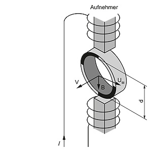 UM = индуцированное в веществе измерительное напряжение, возникающее вертикально к магнитному полю и к направлению потока. Оно снимается на двух точечных электродах.