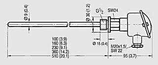 Ввинчивающийся термометр сопротивления низкого давления с соединительной головкой, без консоли, размеры в мм (дюймах)