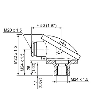 Соединительная головка, форма B, класс защиты IP 54, из легкого металла (литье), с резьбовой крышкой, размеры в мм (дюймах)