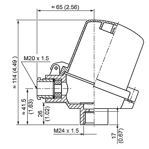 Соединительная головка, форма B, класс защиты IP 65, из легкого металла (литье), со стандартной откидной крышкой, размеры в мм (дюймах)