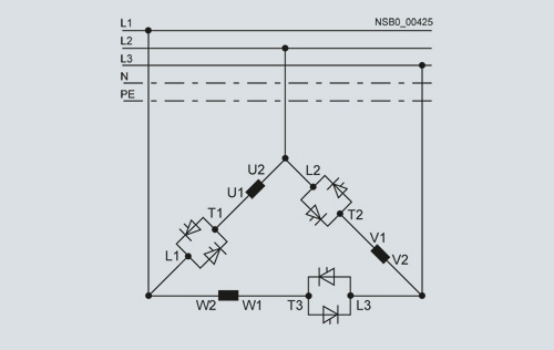 Номинальный ток Ie coответствует примерно 58 % номинального тока двигателя In, 6 проводников к двигателю (как устройство запуска «звезда-треугольник»)