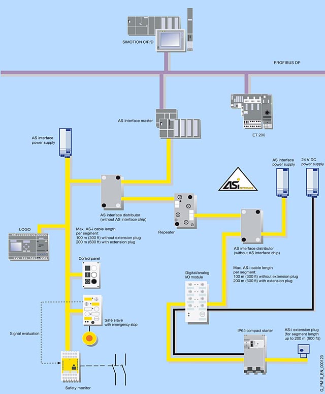 С мостом DP/AS 20E AS-интерфейс может рассматриваться как подсеть для PROFIBUS DP в SIMOTION C, SIMOTION P и SIMOTION D. До 62 ведомых устройств могут работать на шине AS-интерфейса. SIMOTION поддерживаются все цифровые и аналоговые ведомые устройств AS-интерфейса (в соответствие с Аналоговым профилем 7.3 или 7.4).