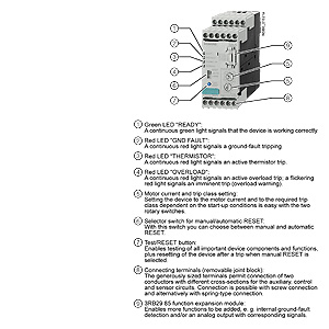 В дополнение к описанной обратнозависимой от тока задержке срабатывания защиты, предотвращающей чрезмерные перегревы двигателей, электронные реле перегрузки 3RB22/3RB23 также позволяют осуществлять прямой контроль температуры обмоток двигателей (полная защита двигателей) путем отказоустойчивого присоединения цепей датчика температуры PTC. С этой температурозависимой защитой двигатели могут быть защищены от перегрева, вызванного уменьшением потока охлаждающего воздуха, которое, например, не может быть обнаружено только путем контроля тока. В случае перегревания устройство отключает контактор и, таким образом, двигатель посредством вспомогательных контактов. О состоянии расцепления сигнализирует постоянно светящийся красный светодиод "Thermistor" (Термистор).