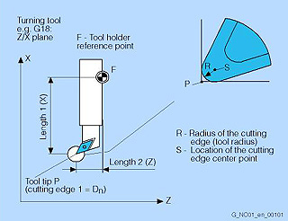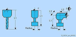 При разработке программы такие параметры инструмента, как диаметр фрезы, положение резца и длина инструмента не должны приниматься во внимание. Вы напрямую программируете размеры детали, например, соответственно рабочему чертежу. Тогда при изготовлении детали траектории инструмента, в зависимости от его геометрии, управляются таким образом, чтобы запрограммированный контур мог изготавливаться любым используемым инструментом.