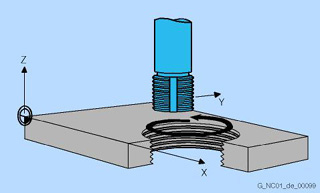 1) Диапазон перемещения оси сверления, таким образом, не сужается. За счет интерполирующего перемещения оси сверления и шпинделя в качестве круговой оси, резьба точно выполняется на конечной глубине сверления (напр., для резьбы в глухих отверстиях).