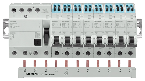 - Монтаж RCCBs на шину (3-phase+N), которая должна быть обрезана. Испытаннная и часто использзуемое применение.