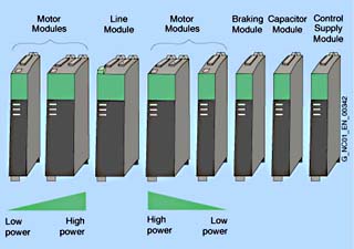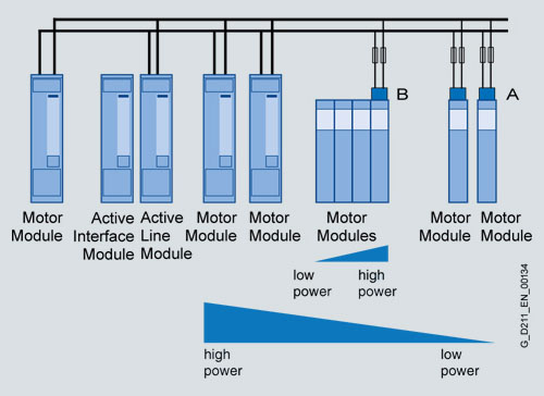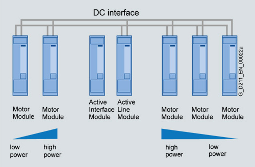 - Модули двигателя должны располагаться слева или справа от Модуля питания в порядке убывания номинальных токов (т.е. модуль двигателя с наибольшим номинальным током располагается рядом с Модулем питания, в то время как Модуль Двигателя с наименьшим номинальным током располагается последним). Кабели/шины для сети DC должны соответствовать требованиям по пропускной способности по току для всех подключённых модулей двигателя.