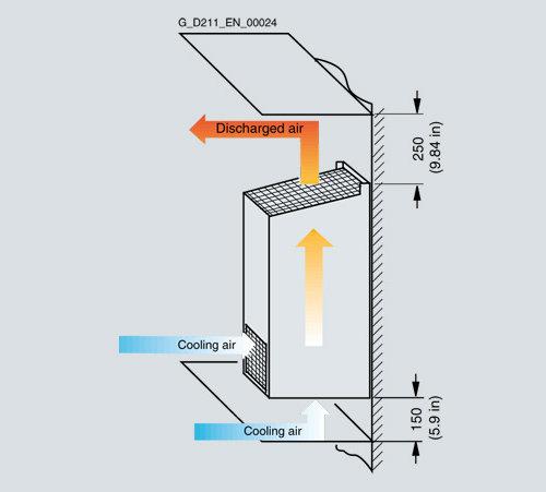 - При установке на стене сетевые реакторы и сетевые фильтры требуют воздушного промежутка в 100 мм (3,94 дюйма) сверху и снизу соответственно. Зазор в 100 мм вокруг сетевого реактора должен быть обеспечен для минимизации риска магнитного влияния на другие компоненты или кабели. Специальные платы экраны могут быть использованы для уменьшения влияния магнитного поля.