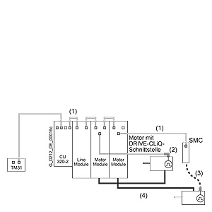 На двигателях с интерфейсом DRIVE CLiQ подача питания 24 В DC осуществляется через кабели DRIVE CLiQи на внешних сенсорных модулях SME 120/SME 125, SME 20/SME 25. На всех других Сенсорных Модулях должен присутствовать отдельный источник питания 24 В DC.