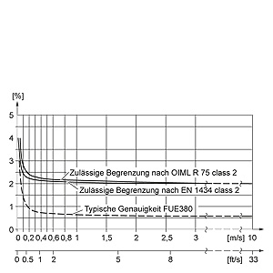 SITRANS FUE380 соответствует требованиям Ef = ±(2 + 0.02 qp/qi) max. ±5%, в соответствии с EN 1434 и OIML R75, класс 2 версия 1. июля 2002