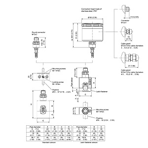 Resistance thermometers in clamp-on technique, round connector, field enclosure, cable gland, versions, dimensions in mm (inch)