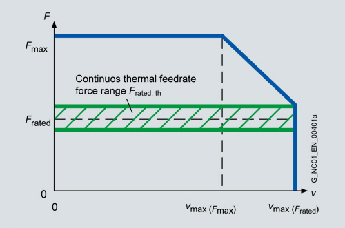 Линейные моторы 1FN6 обладают высокой перегрузочной способностью. Максимальный момент FMAX может быть достигнут только на скорости до vMAX(FMAX); на скорости до vMAX(Frated),   достижим всегда только момент Frated .