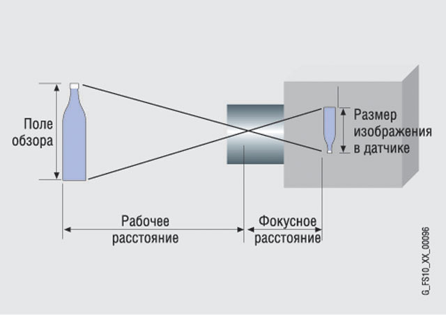 Требуемый размер поля изображения (высота и ширина изображения), размер микросхемы датчика и фокусное расстояние линзы определяют рабочее расстояние:
