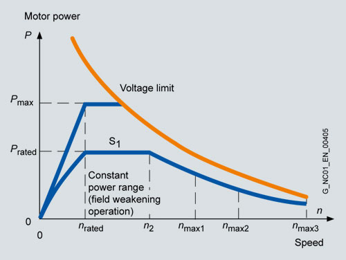 Typical speed/power graph for 1PH8 asynchronous motors1)