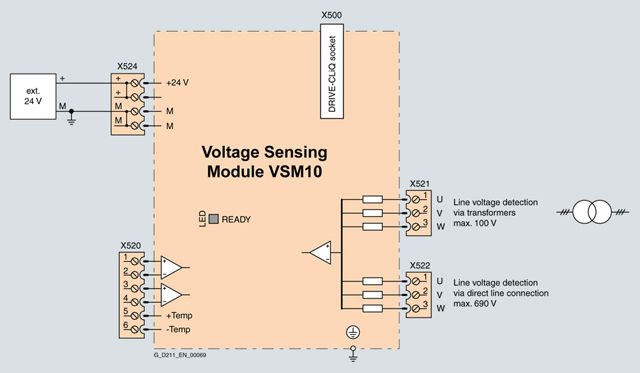 Модуль датчика напряжения VSM10 обменивается сообщениями по DRIVE-CLiQ с модулем управления CU320 или SIMOTION D.