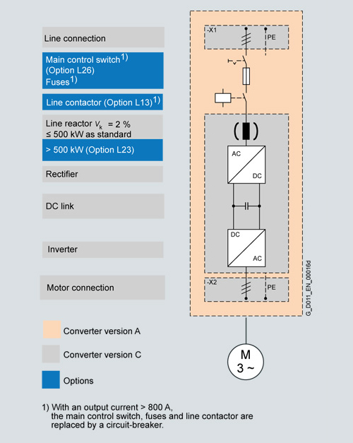 Базовая конструкция преобразователя SINAMICS G150 с дополнительными опциями на входе, которые определяют исполнение