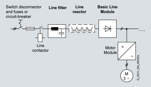Базовые линейные модули разработаны только для операции подачи энергии, т.е. они не поддерживают функцию восстановления регенеративной энергии в системе питания. Если производится регенеративная энергия, например при торможении привода, она должна быть преобразована в тепловую энергию с использованием модуля торможения и тормозного резистора. Если базовые линейные модули используются для подачи энергии, необходимо установить соответствующий линейный реактор. Также можно установить линейный фильтр для ограничения кондуктивных помех до ограничений класса C2 (EN 61800 3)