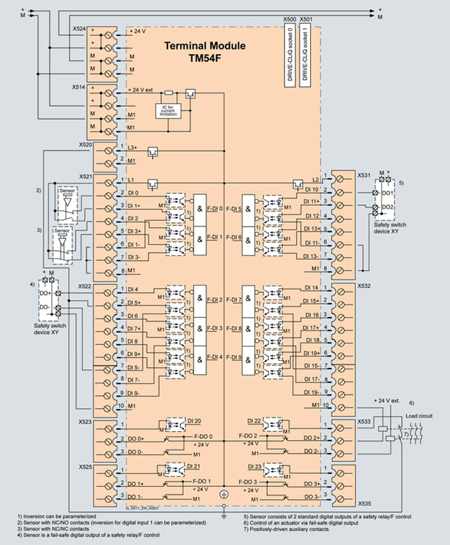 Терминальный модуль TM54F подключается к модулям управления CU310, CU320, SIMOTION D или SIMOTION CX32 по DRIVE-CLiQ.