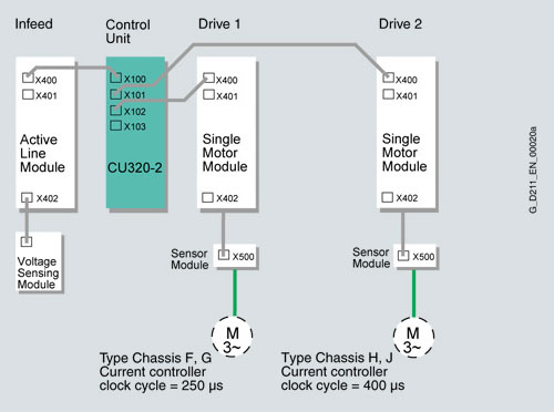 Для модулей, подсоединенных через интерфейс DRIVE CLiQ, можно настроить только один текущий цикл контроллера. Поэтому через DRIVE-CLiQ подсоединяются сразу несколько модулей с одинаковым циклом контроллера. Для упрощения процедуры настройки рекомендуется подпитывать линейный модуль и модули двигателя через отдельные соединения с интерфейсом DRIVE CLiQ.
