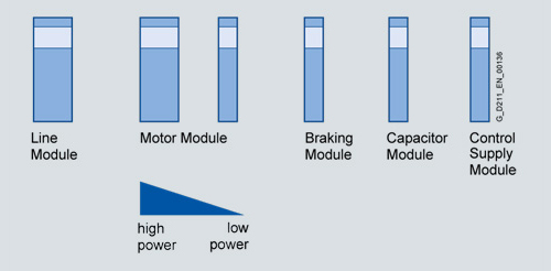 Многоосевой привод SINAMICS S 120 состоит из Модуля Линии, Модулей Двигателя, компонентов цепи DC, Блока Управления и вспомогательных модулей расширения.