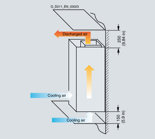 При установке на стену, сетевым дроселям и сетевым яильтрам требуется вентиляционное пространство 100 мм (3,94 дюйма)