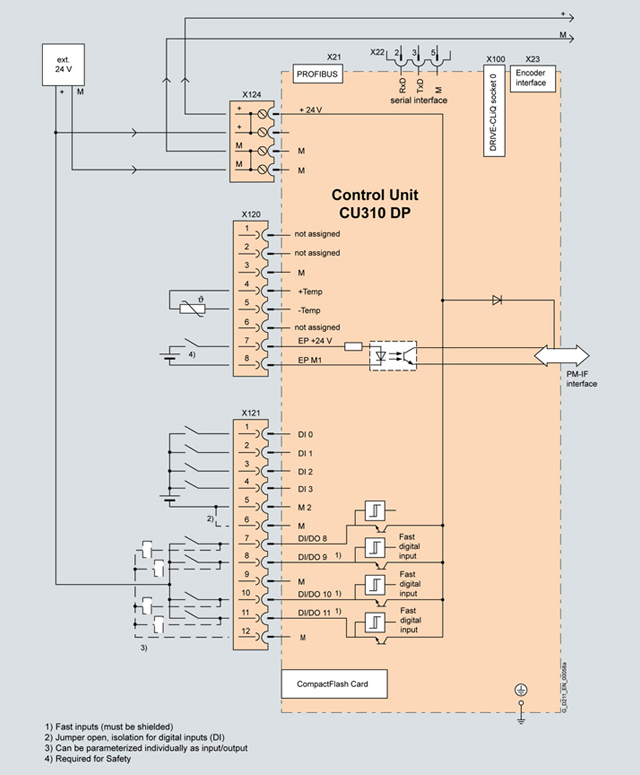 Блок управления CU310 DP взаимодействует с системами правления более высокого уровня с помощью PROFIBUS и профиля PROFIdrive V4, Интегрированные функции безопасности, такие как "Защитный механизм отключения привода“ (= "Безопасное отключение“) должны быть разделены на два канала. Два цифровых входа на блоке управления CU310 DP необходимы для выполнения этой задачи.
