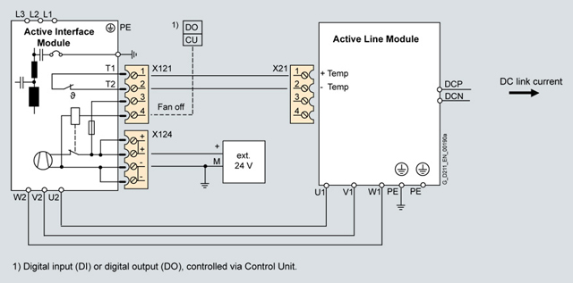 Вентилятор вращается при подключении 24 В DC питания и, при необходимости (срок службы, шум), может быть выключен через Блок управления через вход "Выключение вентилятора". Выключать вентилятор разрешено только когда питание системы не работает, иначе Активный интерфейсный модуль перегреется.