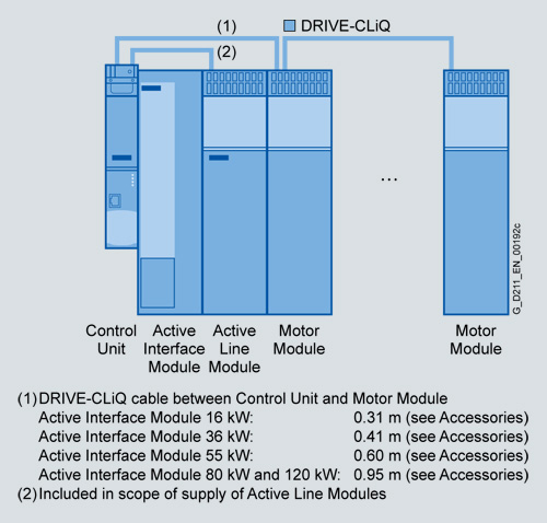 В зависимости от положения Активного интерфейсного модуля в системе приводов, могут потребоваться дополнительные кабели DRIVE-CLiQ. Если Активный интерфейсный модуль установлен с левой стороны Блока управления и Активного модуля питания, то никакие дополнительные кабели DRIVE-CLiQ не требуются. Если Активный интерфейсный модуль помещен между Блоком управления и Активным модулем питания, то кабели DRIVE-CLiQ, подводимые от Активного модуля питания, можно использовать для настройки топологии линии, т.е. подключение последовательно на одной линии DRIVE-CLiQ всех Моторных модулей и Активного модуля питания. Если Активный модуль питания подключен по отдельной линии DRIVE-CLiQ, то кабель DRIVE-CLiQ отмеченный (1) должен быть заказан. Кабель DRIVE-CLiQ, используемый для подключения (2), включен при поставке в комплектацию Активного модуля питания. Для подключения DRIVE-CLiQ в различных конфигурациях, смотрите раздел "Система связи".