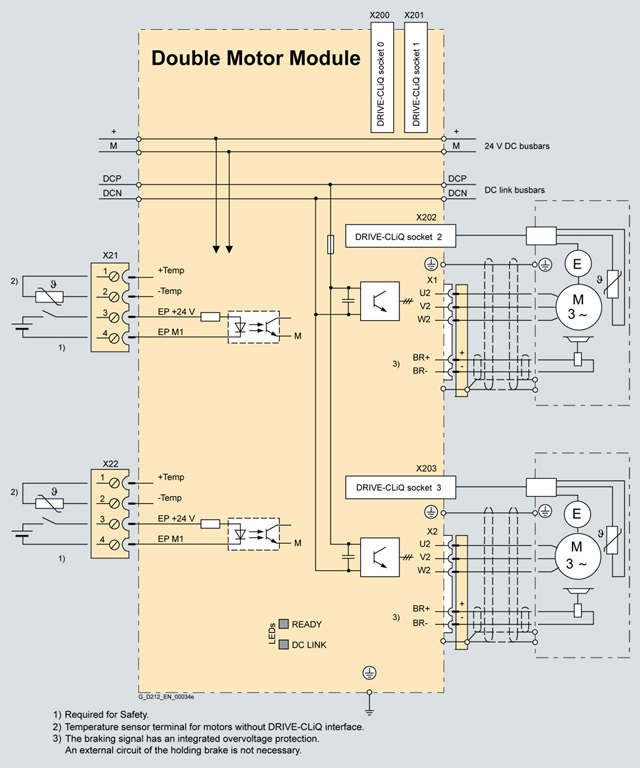 Двухдвигательные модули связаны c модулем управления по DRIVE‑CLiQ.