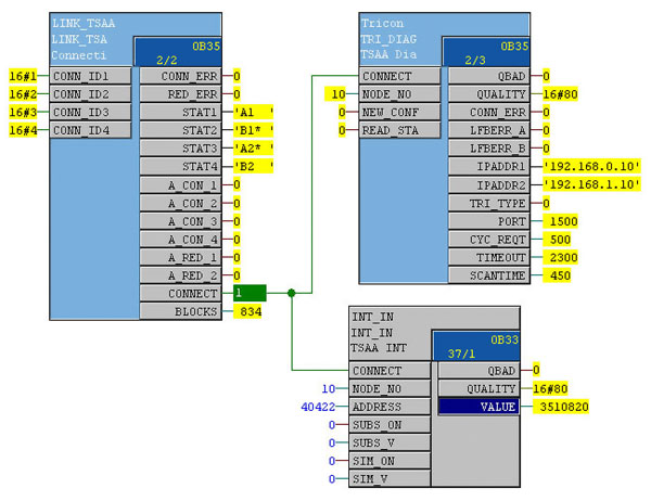 В функциональных блоках SIMATIC PCS 7, теги Triconex адресуются напрямую, через Triconex Alias . Это упрощает конфигурирование с помощником SIMATIC PCS 7, при вводе в эксплуатацию. Используя интегрированные функции симуляции, конфигурация SIMATIC PCS 7 может быть протестирована без безопасного контроллера.