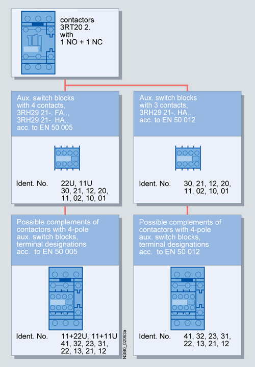 Все контакторы типоразмера S00 с одним вспомогательным контактом (идентификационные номера 10E или 01) и контакторы с 4-мя главными контактами могут быть расширен до контакторов с 3 или 5 вспомогательными контактами с использованием блоков вспомогательных контактов с идентификационными номерами от 40 до 02 (если контактор с 4-мя главными контактами: 2 или 4 вспомогательных контакта) в соответствии с EN 50005.