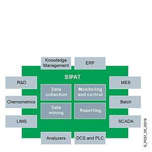 SIMATIC SIPAT от Siemens является соответствующей программной платформой для интеграции PAT в перерабатывающую промышленность. PAT может быть интегрирована в новую или уже существующую инфраструктуру. Это может быть SCADA/Система управления технологическим процессом (опционально с batch процессами), системы управления производством (MES), планирование и управление ресурсами предприятия (ERP), лабораторная информационная система(LIMS), порталы данных, базы знаний, и т.д.. Соединение с системой управления процессом SIMATIC PCS7 через OPC.