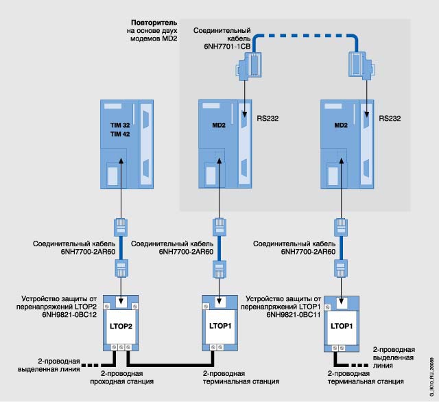 Примеры возможных вариантов соединений с использованием стандартных компонентов приведены ниже (соединительный кабель 6NH7 700-2AR60). Каждый модем MD2 может быть сконфигурирован как терминальное устройство 2-, 2х2- или 4-проводной выделенной линии (примеры конфигурирования терминальных и промежуточных подключений приведены выше).